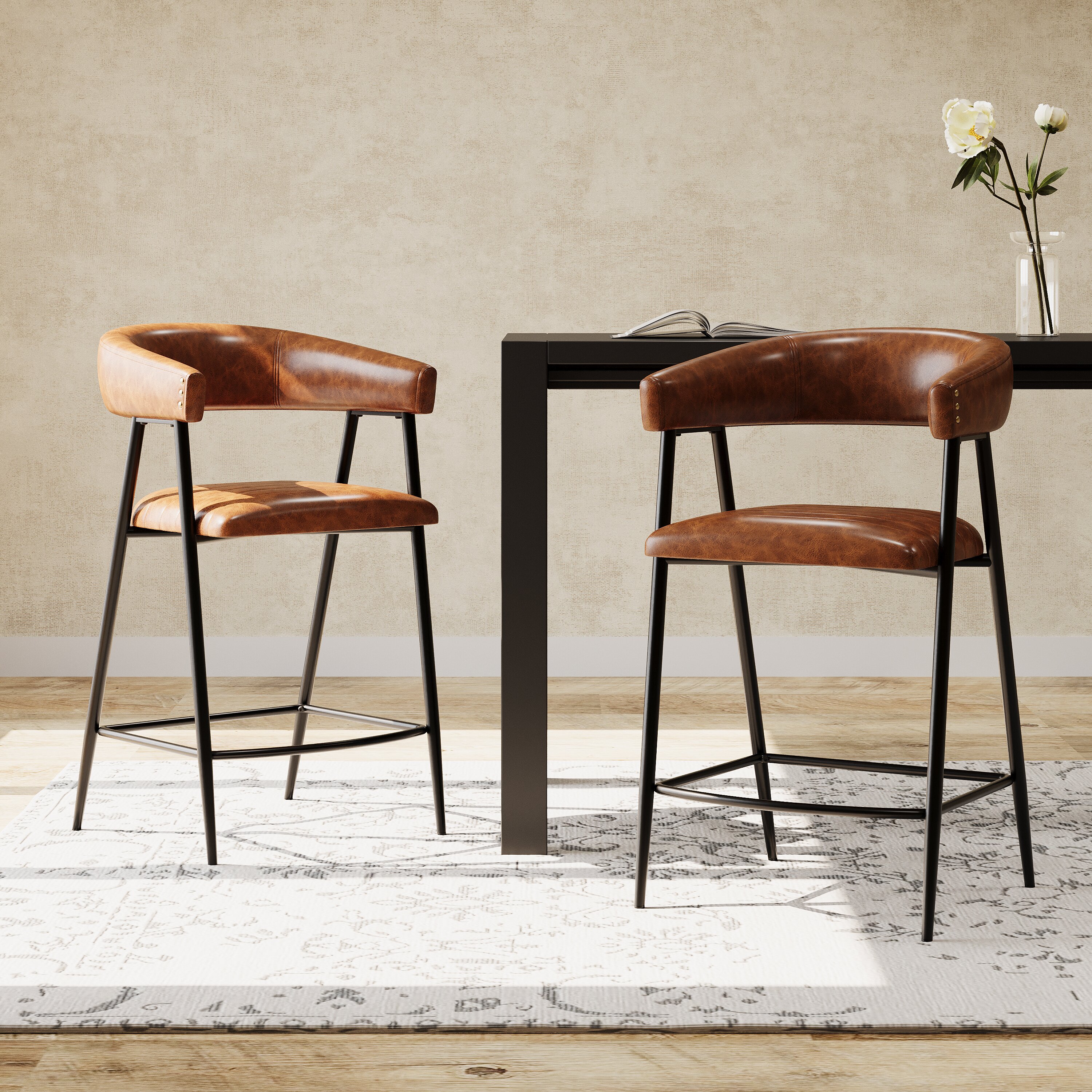 Enhance your dining or kitchen area with this set of two modern counter stools, featuring a comfortable seat height of 26 inches. Upholstered in durable PU leather, these stools provide a stylish and easy-to-clean seating option. The robust iron frame ensures stability and longevity, while the rich brown and black tones add a contemporary flair. Perfect for casual meals or entertaining, these counter stools blend comfort and style effortlessly, making them a versatile addition to any space.